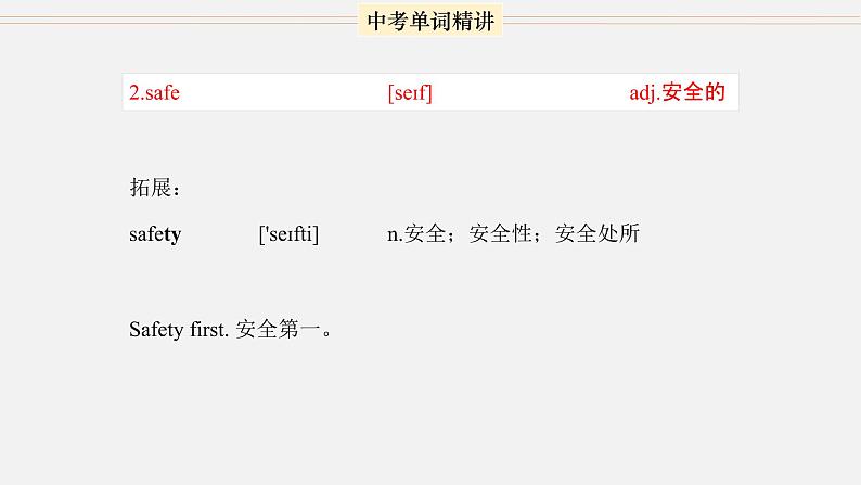 2.safe[seɪf] adj.安全的拓展:safety['seɪfti]n.安全;安全性;安全处所Safety first. 安全第一。