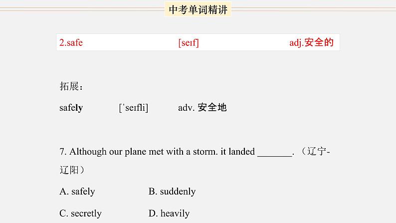 2.safe[seɪf] adj.安全的拓展:safely [ˈseɪfli] adv. 安全地7. Althugh ur plane met with a strm. it landed _______. (辽宁-辽阳)A. safely B. suddenly C. secretly D. heavily