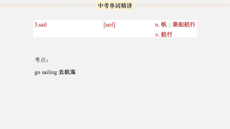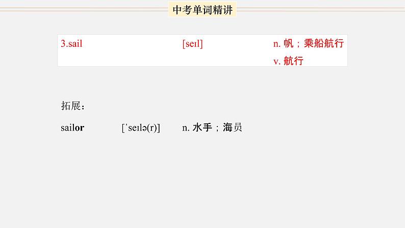 3.sail[seɪl]n. 帆;乘船航行 v. 航行拓展:sailr [ˈseɪlə(r)] n. 水手;海员