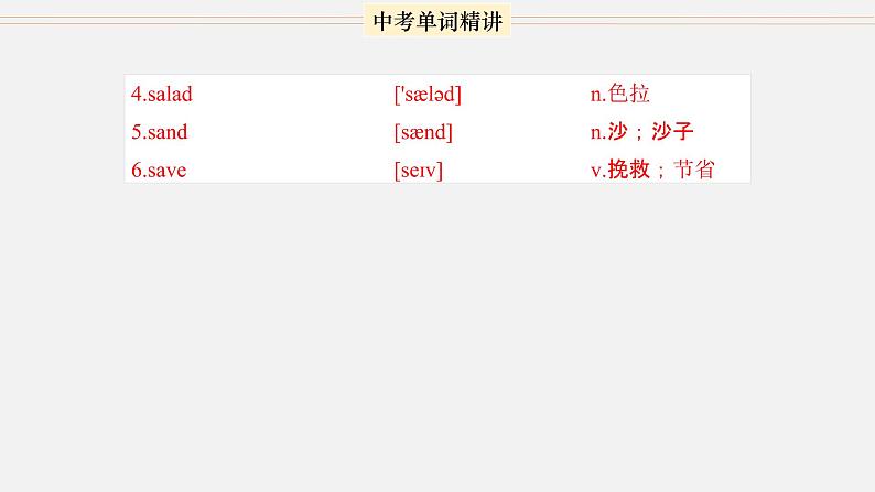 4.salad['sæləd]n.色拉5.sand[sænd]n.沙;沙子6.save[seɪv]v.挽救;节省