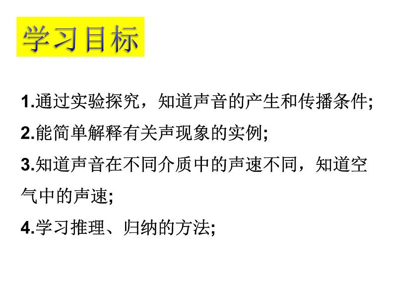 (一)、声音的产生 声音是由物体的振动产生的。 (二)、声音的传播 声音的传播需要介质(气体、液体、固体),真空不能传声。 声音以声波的形式传播(三)、声速 声速的大小跟介质的种类有关;还跟介质的温度有关。 15℃时空气中的声速是340m/s。(四)、回声 声音在传播过程中,遇到障碍物被反射回来的现象。