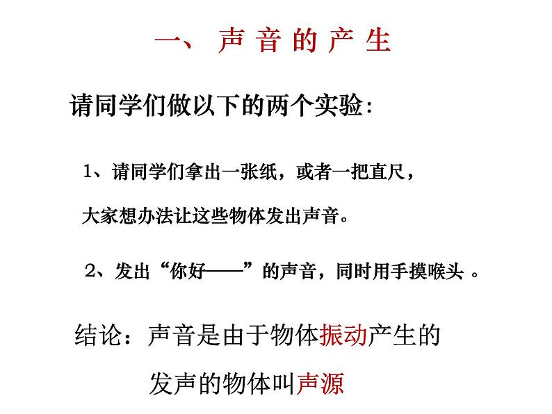 1、请同学们拿出一张纸,或者一把直尺,大家想办法让这些物体发出声音。