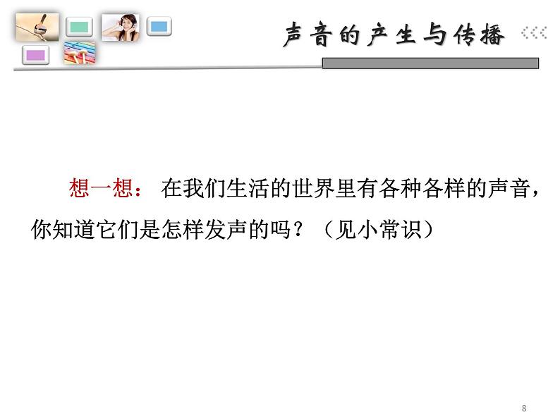 想一想: 在我们生活的世界里有各种各样的声音,你知道它们是怎样发声的吗?(见小常识)