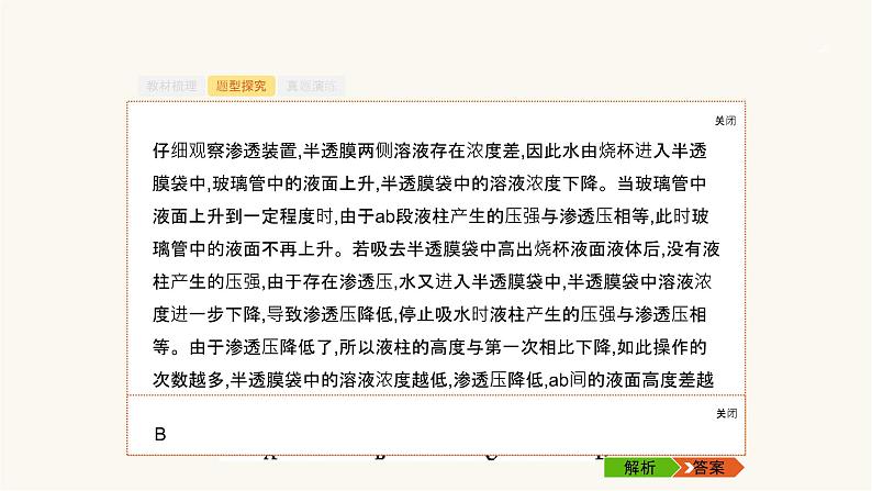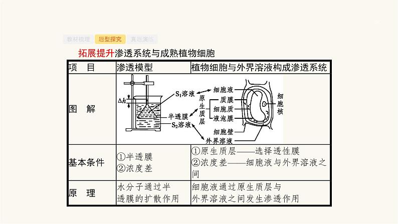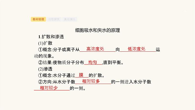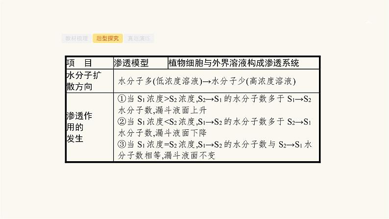 易错提醒渗透≠渗透作用≠渗透现象(1)概念:水分子通过膜的扩散称为渗透;渗透作用是指水分子从水分子数相对较多的一侧通过膜进入水分子数相对较少的一侧。由于渗透作用,通过一定的装置可以观察到渗透现象。(2)渗透作用发生的条件:①具有半透膜;②半透膜两侧溶液具有浓度差;③表现出水分子的移动方向:浓度低→浓度高(顺着水分子的相对含量的梯度)。(3)膜两侧有浓度差时的渗透为渗透作用;分子的运动是绝对的,半透膜两侧的水分子对等运动时,达到平衡状态,不称为渗透作用。