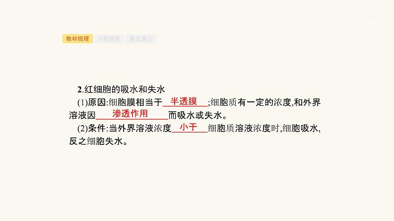 2.红细胞的吸水和失水(1)原因:细胞膜相当于 ;细胞质有一定的浓度,和外界溶液因 而吸水或失水。 (2)条件:当外界溶液浓度 细胞质溶液浓度时,细胞吸水,反之细胞失水。
