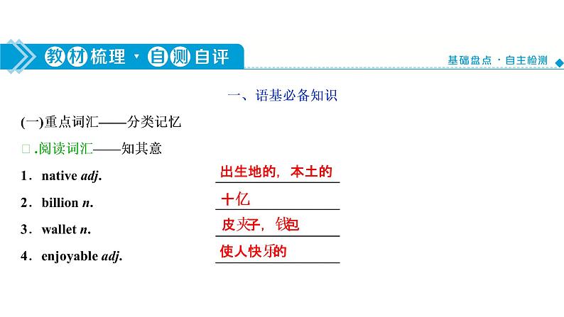 高考英语一轮复习必修第3册UNIT5 THE VALUE OF MONEY课件: 这是一份高考英语一轮复习必修第3册UNIT5 THE VALUE OF MONEY课件,共60页。PPT课件主要包含了必备知识·自主检测,loan ,plastic ,judge ,spotted ,dare ,sort ,postpone ,opera ,hug 等内容,欢迎下载使用。