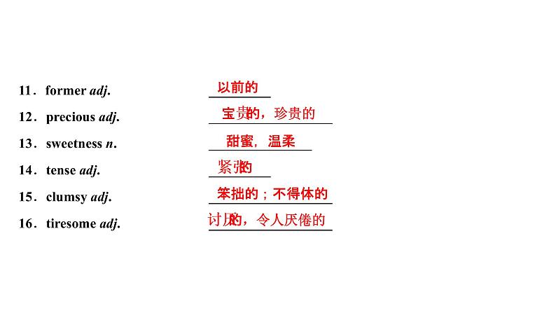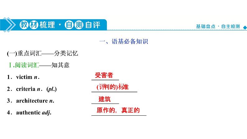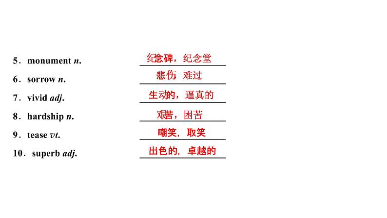 这是一份高考英语一轮复习unit 16 stories课件,共60页。PPT课件主要包含了受害者,评判的标准,原作的真正的,纪念碑纪念堂,悲伤难过,生动的逼真的,艰苦困苦,嘲笑取笑,出色的卓越的,以前的等内容,欢迎下载使用。