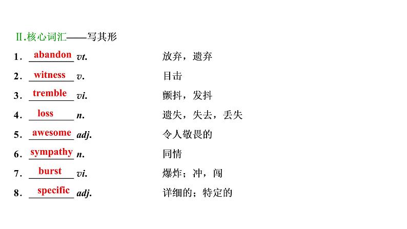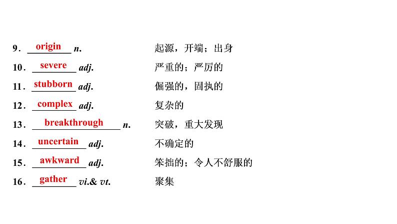 这是一份高考英语一轮复习6 unit 16 stories课件,共60页。PPT课件主要包含了work ,loss ,burst ,witness ,occur ,severe ,apparent ,suffering ,gradual ,abandon 等内容,欢迎下载使用。