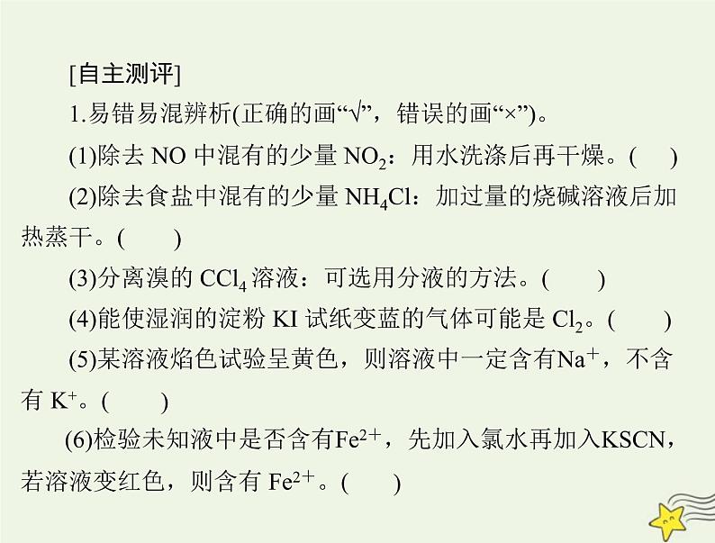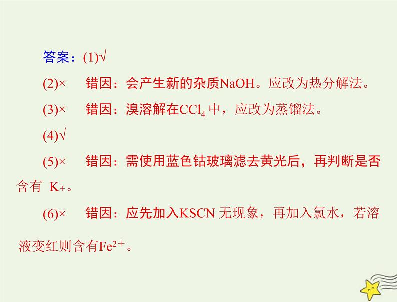 错因:会产生新的杂质NaOH。应改为热分解法。错因:溴溶解在CCl4 中,应改为蒸馏法。错因:需使用蓝色钴玻璃滤去黄光后,再判断是否错因:应先加入KSCN 无现象,再加入氯水,若溶
