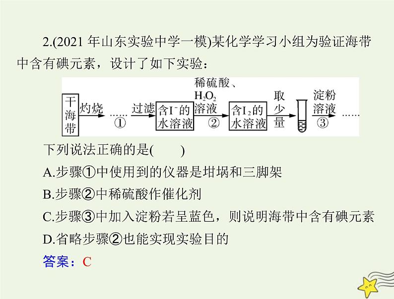 2.(2021 年山东实验中学一模)某化学学习小组为验证海带中含有碘元素,设计了如下实验: