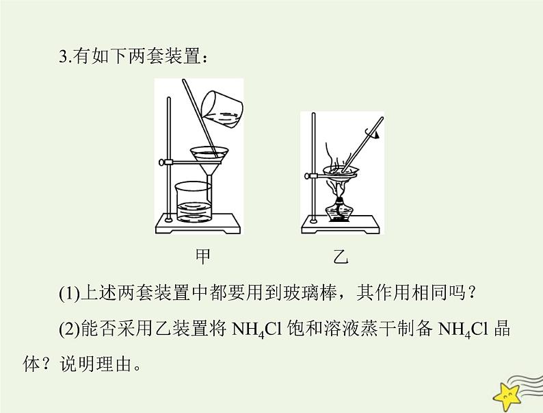 (1)上述两套装置中都要用到玻璃棒,其作用相同吗?(2)能否采用乙装置将 NH4Cl 饱和溶液蒸干制备 NH4Cl 晶体?说明理由。