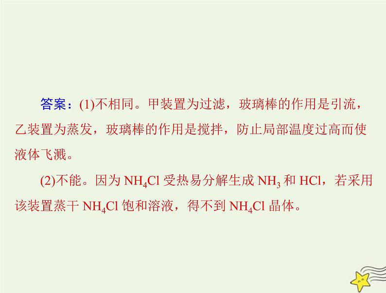 答案:(1)不相同。甲装置为过滤,玻璃棒的作用是引流,乙装置为蒸发,玻璃棒的作用是搅拌,防止局部温度过高而使液体飞溅。