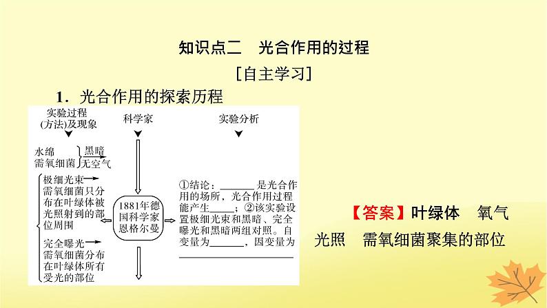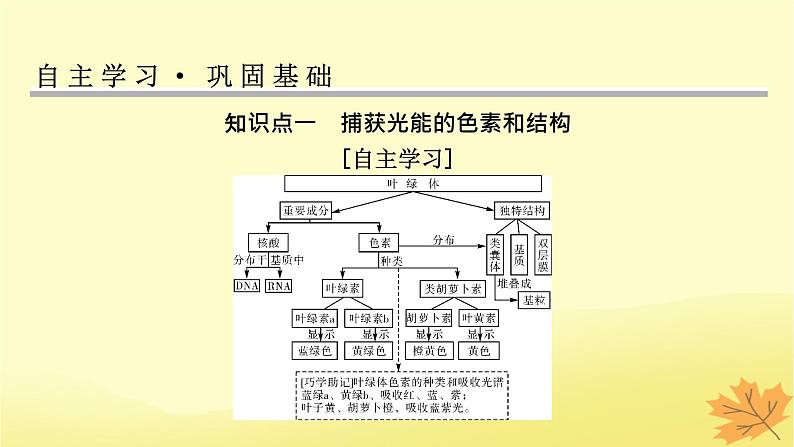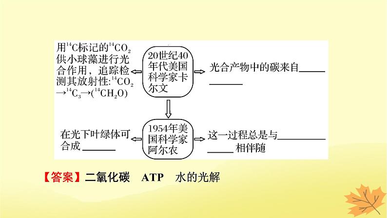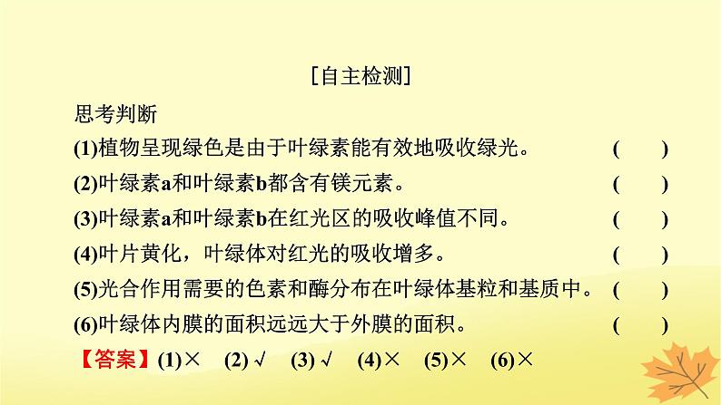 展开第3讲 光合作用与能量转化自 主 学 习 · 巩 固 基 础[自主学习]知识点一 捕获光能的色素和结构[自主检测]思考判断(1)植物呈现绿色是由于叶绿素能有效地吸收绿光。 ( )(2)叶绿素a和叶绿素b都含有镁元素。 ( )(3)叶绿素a和叶绿素b在红光区的吸收峰值不同。 ( )(4)叶片黄化,叶绿体对红光的吸收增多。 ( )(5)光合作用需要的色素和酶分布在叶绿体基粒和基质中。 ( )(6)叶绿体内膜的面积远远大于外膜的面积。 ( )【答案】(1)× (2)√ (3)√ (4)× (5)× (6)×[自主学习]知识点二 光合作用的过程1.光合作用的探索历程【答案】叶绿体 氧气 光照 需氧细菌聚集的部位 【答案】水的光解 氧气 同位素标记 光合作用释放的氧气 【答案】二氧化碳 ATP 水的光解2.光合作用的过程【答案】光、色素、酶 类囊体薄膜 ATP和NADPH中活跃的化学能 酶、NADPH、ATP 叶绿体基质 有机物中稳定的化学能 巧记光合作用过程的“一、二、三、四”3.光合作用和化能合成作用的比较光能 无机物氧化释放的能量 硝化细菌 CO2和H2O (1)同位素标记法中使用的同位素不都具有放射性,如18O就没有放射性。不能检测其放射性;而14C有放射性,可被追踪检测。(2)光合作用过程中的NADPH和呼吸作用中的[H](NADH)不同,光合作用中NADPH是还原型辅酶Ⅱ的简化表示方法。(3)绿色植物和化能合成作用菌为自养生物,人、动物、真菌以及大多数细菌属于异养生物。(4)C3和C5并不是只含有3个或5个碳原子,还有H、O等原子,如丙酮酸(C3H4O3)就是一种三碳化合物。[自主检测]1.思考判断(1)光合作用光反应阶段产生的NADPH可在叶绿体基质中作为还原剂。 ( )(2)H2O在光下分解为NADPH和O2的过程发生在叶绿体基质中。 ( )(3)只提供光照,不提供CO2,植物可独立进行光反应。 ( )(4)在其他条件适宜情况下,在供试植物正常进行光合作用时突然停止光照,并在黑暗中立即开始连续取样分析,在短时间内,叶绿体中C3和C5含量都迅速增加。 ( )(5)正常生长的绿藻,照光培养一段时间后,用黑布迅速将培养瓶罩上,其叶绿体内CO2的固定立即停止。 ( )(6)土壤中的硝化细菌可利用CO2和H2O合成糖。 ( )【答案】(1)√ (2)× (3)× (4)× (5)× (6)√2.深挖教材(1)光合作用过程中产生的ATP与细胞呼吸过程中产生的ATP的利用不同是____________________________。(2)研究小组将生长状况相似的菠菜幼苗均分为A、B两组进行实验探究,A组培养在完全培养液中,B组培养在缺Mg2+的完全培养液中,其他条件相同且适宜。培养一段时间后,检测并比较两组菠菜幼苗的干物质的量,B组明显少于A组,原因是____________________________。【答案】(1)提示:光反应阶段产生的ATP用于暗反应阶段C3的还原和叶绿体中蛋白质、核酸的合成。细胞呼吸产生的ATP可用于除光合作用以外的生命活动(2)提示:Mg2+是合成叶绿素的原料,缺少Mg2+不利于叶绿素的合成,光反应产生的NADPH和ATP不足,C3的还原减少,形成的(CH2O)减少3.热图导析如图1、2、3所示为光合作用探索历程中的经典实验的分析及拓展(图1中叶片黄白色部分不含叶绿体)请思考:(1)图1中a~d可构成哪些对照组?其验证的结论分别是什么?______________________________________________________________________________________________________________。(2)图2所示实验运用了何种技术?可得出何种推论?__________________________________________________。(3)图3所示实验在实验材料的选取上有什么巧妙之处?该实验对环境有何特殊要求?其目的是什么?实验结果怎样?可得出何种结论?_________________________________________________________________________________________________________。【答案】(1)提示:图1中b和c部位都是绿色叶片,即都含有叶绿体,二者的区别在于有无光照,通过对比可以说明光合作用需要光照;a和b部位都有光照,二者的区别在于有无叶绿体,通过对照可以说明光合作用需要叶绿体(2)提示:图2所示实验运用了同位素标记法,该对比实验说明光合作用产生的O2来源于H2O,而不是来自CO2(3)提示:图3实验选择水绵和需氧细菌,水绵的叶绿体呈螺旋式带状,便于观察;用需氧细菌可以确定释放氧气多的部位。该实验要在没有空气的黑暗环境中进行以排除氧气和极细光束外的其他光的干扰,实验结果是需氧细菌分布于叶绿体被光束照射的部位,由此证明叶绿体是光合作用的场所,氧气是由叶绿体释放出来的[自主学习]知识点三 光合作用原理的应用1.光合作用强度【答案】糖类 消耗 生成2.影响光合作用强度的因素 【答案】①水分 ②温度 ③CO2浓度 ④长短、强弱[自主检测]1.思考判断(1)生长于较弱光照条件下的植物,当提高CO2浓度时,其光合速率未随之增加,主要限制因素是光照强度。 ( )(2)延长光照时间能提高光合作用强度。 ( )(3)植物体从土壤中吸收的水分主要用于光合作用。 ( )(4)停止供水,植物光合速率下降,这是由于水既是光合作用的原料,又是光合产物在植物体内运输的主要介质。 ( )(5)夏季晴天,植物出现光合“午休”现象的主要原因是环境中CO2浓度过低。 ( )【答案】(1)√ (2)× (3)× (4)√ (5)×2.深挖教材哈密瓜盛产于新疆的哈密地区。在哈密地区农作物生长季节里,阳光充沛、昼夜温差大。分析回答:(1)从影响哈密瓜生长的环境因素分析,哈密瓜特别甜的原因是__________________________。(2)如果你的家乡想种哈密瓜并使瓜甜,仅从光合作用的角度分析,你认为应当采取的措施有__________________________。(3)大棚种植使用有机肥有利于增产,请从