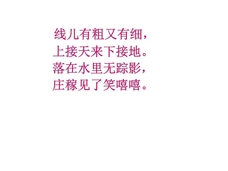 线儿有粗又有细, 上接天来下接地。 落在水里无踪影, 庄稼见了笑嘻嘻。