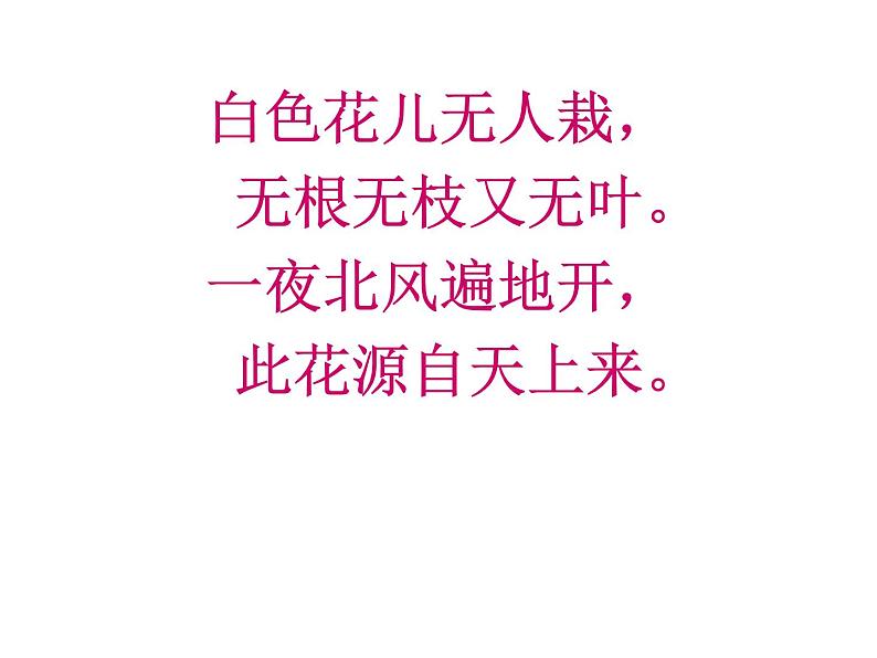 白色花儿无人栽,无根无枝又无叶。一夜北风遍地开,此花源自天上来。