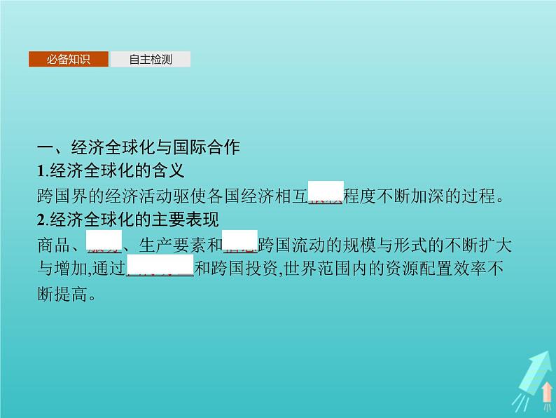 一、经济全球化与国际合作1.经济全球化的含义跨国界的经济活动驱使各国经济相互依赖程度不断加深的过程。2.经济全球化的主要表现商品、服务、生产要素和信息跨国流动的规模与形式的不断扩大与增加,通过国际分工和跨国投资,世界范围内的资源配置效率不断提高。