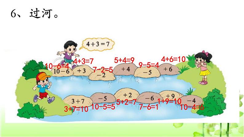练习二5521、画一画,填一填。2、找朋友。3、打靶游戏。9753110864204、连一连。5、看图列式。4599453477436—243+2+5106、过河。7-2=55+4=99-5=44+6=1010-5=55+2=77-6=11+9=1010-4=610-6=44+3=73+7=105343447、摆一摆,算一算。8、每个花瓶里可能有几枝 ?189918说一说,填一填。1 + = + =34235请大家先动手数一数,再列式计算。2+3+5109-3= 8-8= 7-5= 4+3= 3+5= 4+1=3+6= 9-5= 6+2=6790848259个?个9-54※ 还剩下多少?练一练。7–1=6※ 一共有多少?5+5=10156练一练538835通过本节课的复习,你有哪些收获?恭喜你,又进步了!