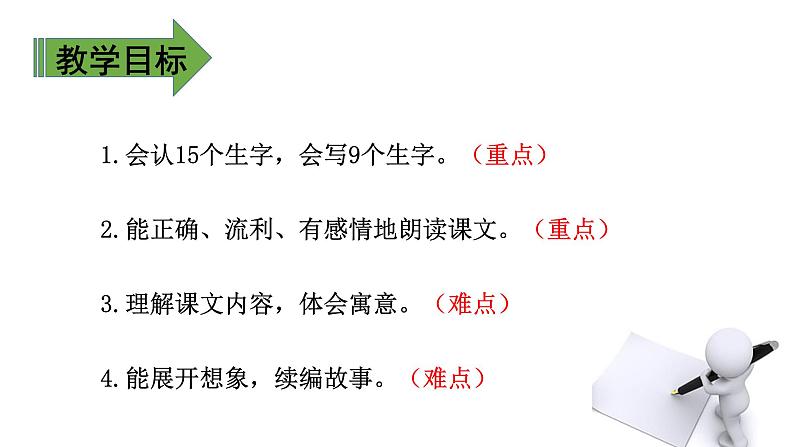 1.会认15个生字,会写9个生字。(重点)2.能正确、流利、有感情地朗读课文。(重点)3.理解课文内容,体会寓意。(难点)4.能展开想象,续编故事。(难点)