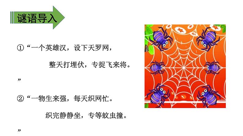 ①“一个英雄汉,设下天罗网, 整天打埋伏,专捉飞来将。”②“一物生来强,每天织网忙。 织完静静坐,专等蚊虫撞。” 谜底:蜘蛛。