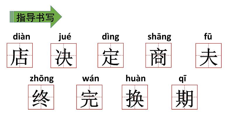 书写注意:“决”的左边不是三点水,而是两点水。“定”的下面不是“人”,二是一撇和一捺,而且左边笔右边要短。“期”是由“其”和“月”组成的。“围”是全包围结构,里面是个“韦”。