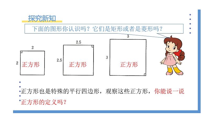 正方形也是特殊的平行四边形,观察这些正方形,你能说一说正方形的定义吗?
