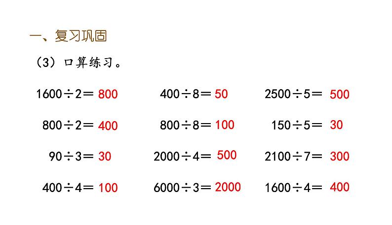 (3)口算练习。 1600÷2= 400÷8= 2500÷5= 800÷2= 800÷8= 150÷5= 90÷3= 2000÷4= 2100÷7= 400÷4= 6000÷3= 1600÷4=