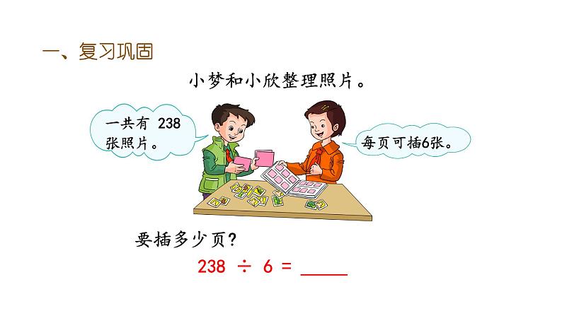 这是一份人教版三年级下册1 位置与方向(一)教学演示ppt课件,共15页。PPT课件主要包含了复习巩固,梳理笔算方法,商×除数=被除数,要插多少页,小梦和小欣整理照片,×4≈80,×3≈240,拓展提升,课堂练习等内容,欢迎下载使用。