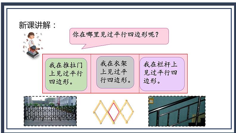 3. 让学生感受生活中平行四边形无处不在,提高学习数学的兴趣。