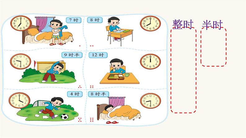 展开北师大版 一年级上册 第八单元 认识钟表整时半时1.认一认。1.认一认。1.认一认。1.认一认。2.连一连。