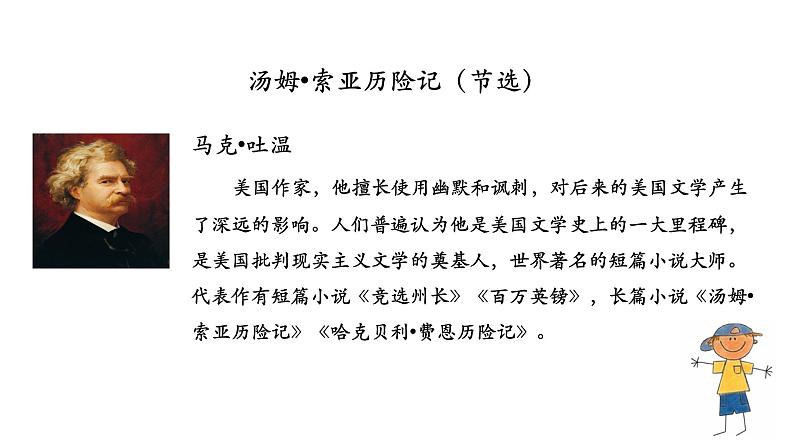1.名著《汤姆·索亚历险记》的作者 马克·吐温 ,是19世纪美国现实主义文学的杰出代表。文中记叙了主人公 汤姆 和小伙伴们惊险、有趣的美国生活。他们为了摆脱繁重的课业和呆板的课堂,用冒险实现自己的理想,用冒险改变自己的环境。在探险的过程中充分地表现了主人公的 聪明、勇敢、正直、真诚、乐观、具有一般孩子没有的想象力 和叛逆精神。 2. 《哈克贝利• 芬恩历险记》 和《汤姆•索亚历险记》被认为是马克•吐温的姊妹篇。马克•吐温出身寒微,心系下层民众,受到敬重,被称为“美国文学中的林肯”。