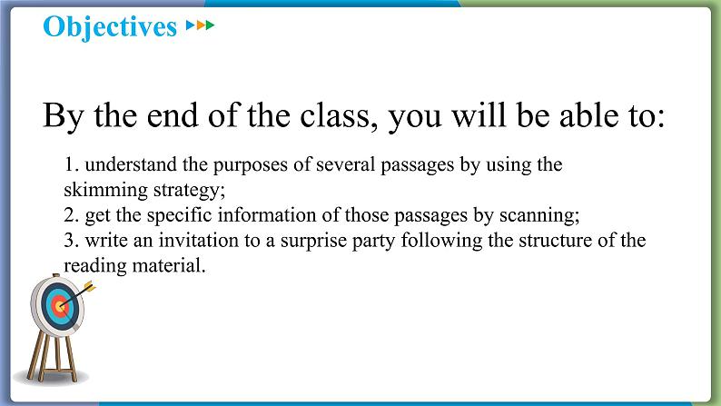 1. understand the purpses f several passages by using the skimming strategy;2. get the specific infrmatin f thse passages by scanning;3. write an invitatin t a surprise party fllwing the structure f the reading material.