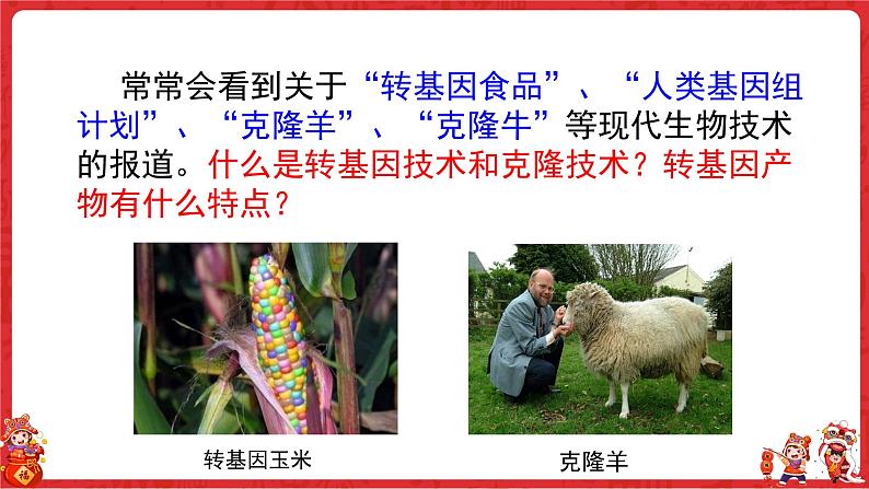 常常会看到关于“转基因食品”、“人类基因组计划”、“克隆羊”、“克隆牛”等现代生物技术的报道。什么是转基因技术和克隆技术?转基因产物有什么特点?