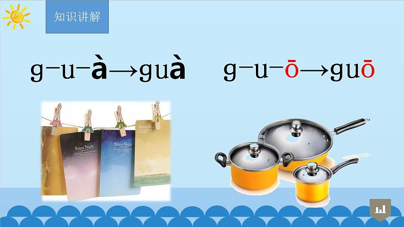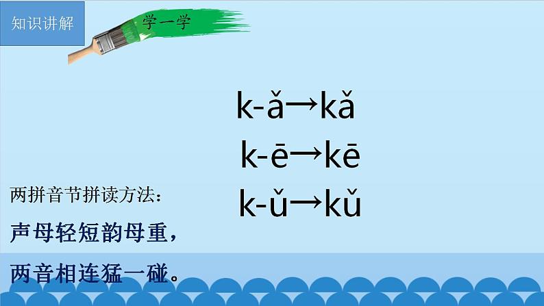 两拼音节拼读方法:声母轻短韵母重,两音相连猛一碰。