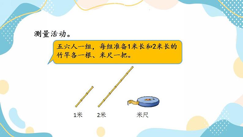 展开五六人一组,每组准备1米长和2米长的竹竿各一根、米尺一把。