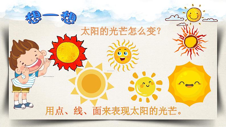 这是一份美术一年级上册17 我的太阳多媒体教学ppt课件,共11页。PPT课件主要包含了各种各样的点,用拟人的方法,演一演等内容,欢迎下载使用。
