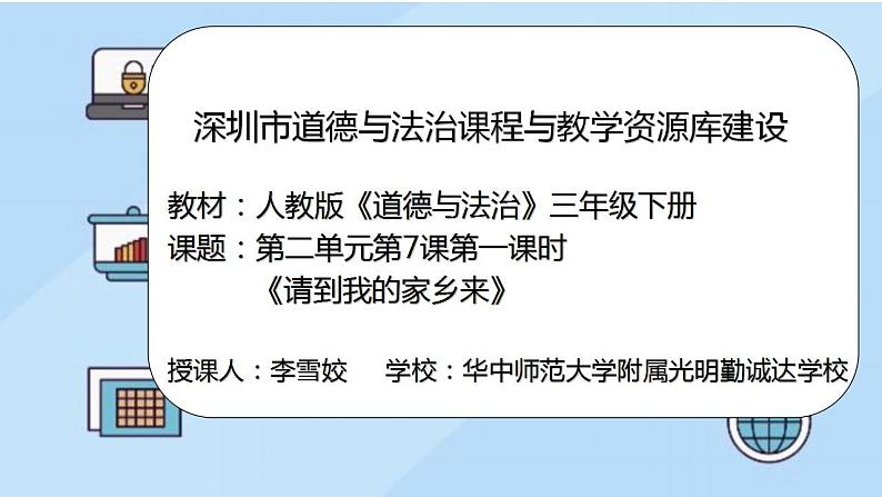 展开深圳市道德与法治课程与教学资源库建设 教材:人教版《道德与法治》三年级下册 课题:第二单元第7课第一课时 《请到我的家乡来》 授课人:李雪姣 学校:华中师范大学附属光明勤诚达学校