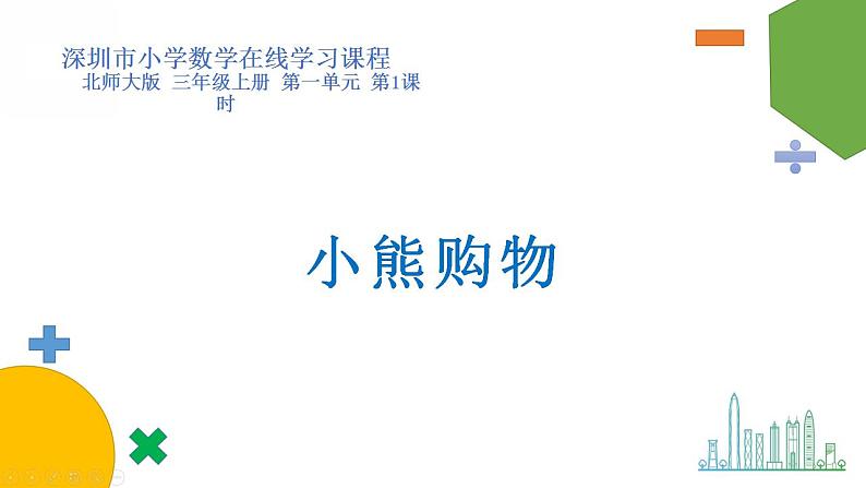 展开北师大版三年级上册1 小熊购物优秀ppt课件: 这是一份北师大版三年级上册1 小熊购物优秀ppt课件,文件包含第一单元第1课时《小熊购物》课件pptx、第一单元第1课时《小熊购物》教案doc等2份课件配套教学资源,其中PPT共16页, 欢迎下载使用。