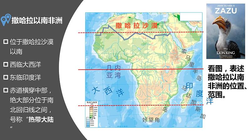 初中中图版第六章 认识地区第四节 撒哈拉以南非洲优秀备课ppt课件: 这是一份初中中图版第六章 认识地区第四节 撒哈拉以南非洲优秀备课ppt课件,共54页。PPT课件主要包含了自然环境,地理位置,①半球位置,②经纬度位置,③海陆位置,“热带大陆”,好望角,地势与地形,东非高原,南非高原等内容,欢迎下载使用。