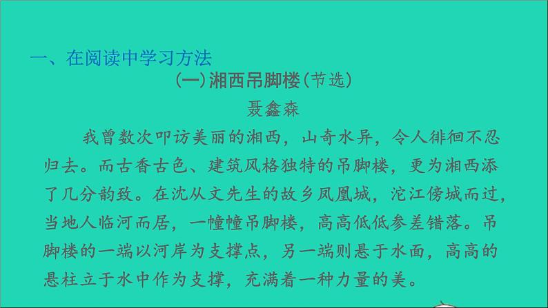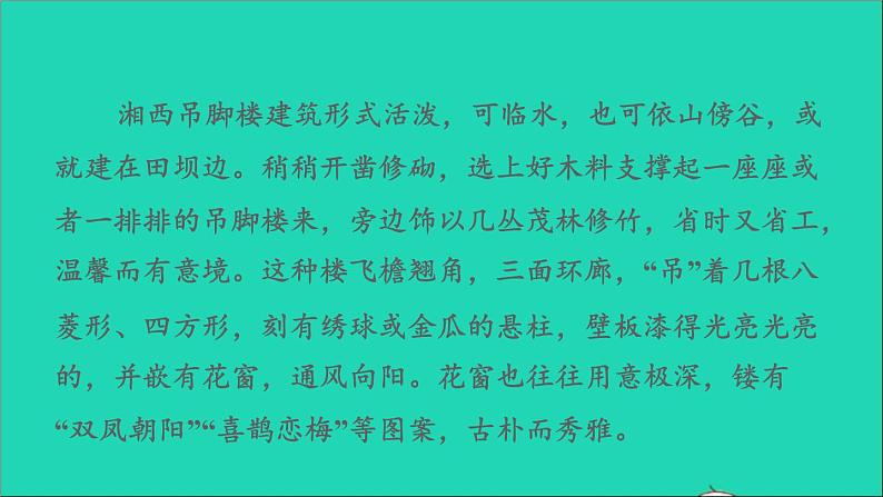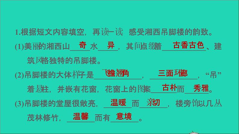 1.根据短文内容填空,再读一读,感受湘西吊脚楼的韵致。(1)美丽的湘西山_____水_____,其间点缀着___________、建筑风格独特的吊脚楼。(2)吊脚楼的大体样子是____________,____________,“吊”着悬柱,并嵌有花窗,花窗上的图案 而______。(3)吊脚楼的堂屋很敞亮,_______而_______,楼旁饰以几丛茂林修竹,_______而有_______。