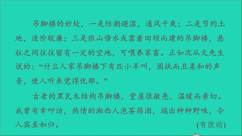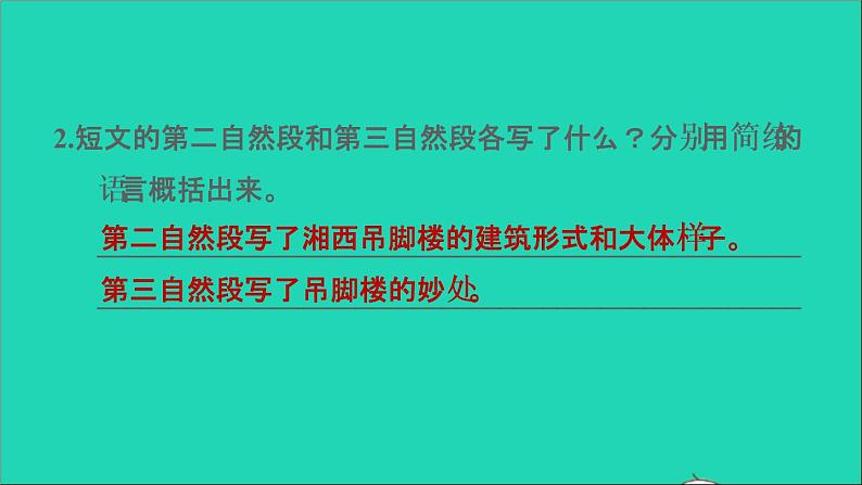 第二自然段写了湘西吊脚楼的建筑形式和大体样子。第三自然段写了吊脚楼的妙处。