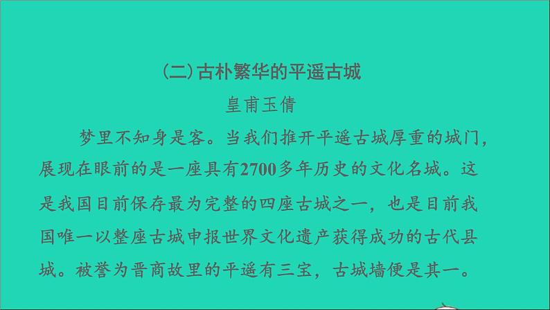 3.作者在介绍平遥古城时,还加入了自己的联想,请你也试着写一写。 走在平遥古城的石板路上,我仿佛_____________________________________________________________ _______________________________________________。