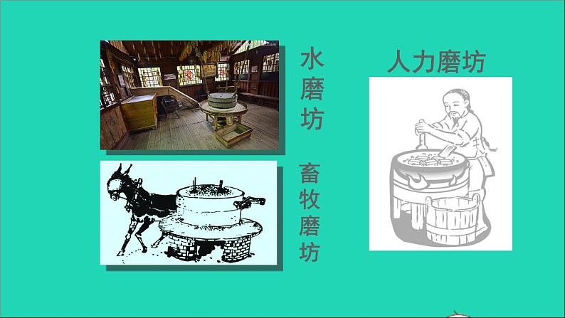 磨坊有很多种 ,有风车磨坊,水磨坊,人力磨坊,畜牧磨坊……古时候用于把米、麦、豆等粮食加工成粉、浆的一种机械。开始用人力或畜力,到了晋代,我国发明用水作动力的水磨。通常由两个圆石做成。过去,北方大部分地区麦黍等粮食脱壳、去皮时使用石碾子,碾子由碾台、碾盘、碾滚和碾架等组成。碾盘中心设