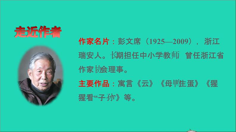 作家名片:彭文席(1925—2009),浙江瑞安人。长期担任中小学教师,曾任浙江省作家协会理事。主要作品:寓言《云》《母鸭生蛋》《猩猩看“子孙”》等。