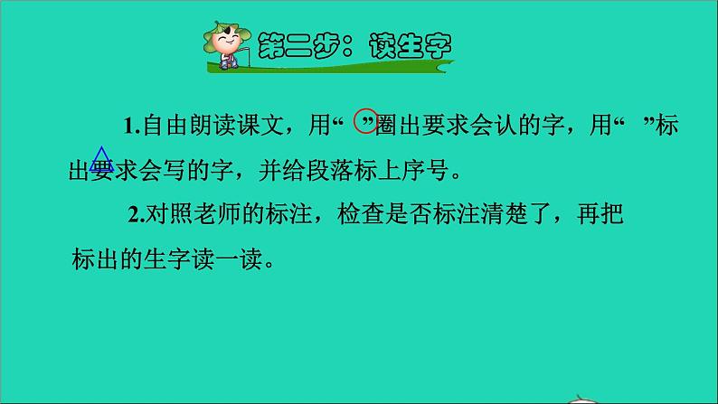 1.自由朗读课文,用“ ”圈出要求会认的字,用“ ”标出要求会写的字,并给段落标上序号。
