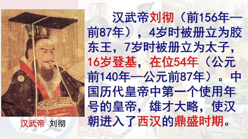 汉武帝刘彻(前156年—前87年),4岁时被册立为胶东王,7岁时被册立为太子,16岁登基,在位54年(公元前140年—公元前87年)。中国历代皇帝中第一个使用年号的皇帝,雄才大略,使汉朝进入了西汉的鼎盛时期。