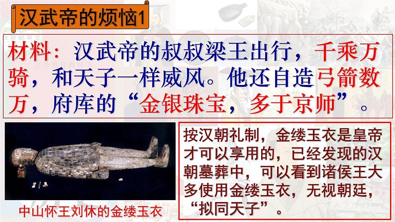 材料:汉武帝的叔叔梁王出行,千乘万骑,和天子一样威风。他还自造弓箭数万,府库的“金银珠宝,多于京师”。