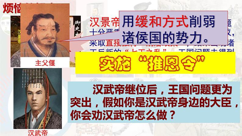 这是一份初中历史人教部编版七年级上册第十二课 汉武帝巩固大一统王朝课文内容ppt课件,共15页。PPT课件主要包含了实施“推恩令”等内容,欢迎下载使用。
