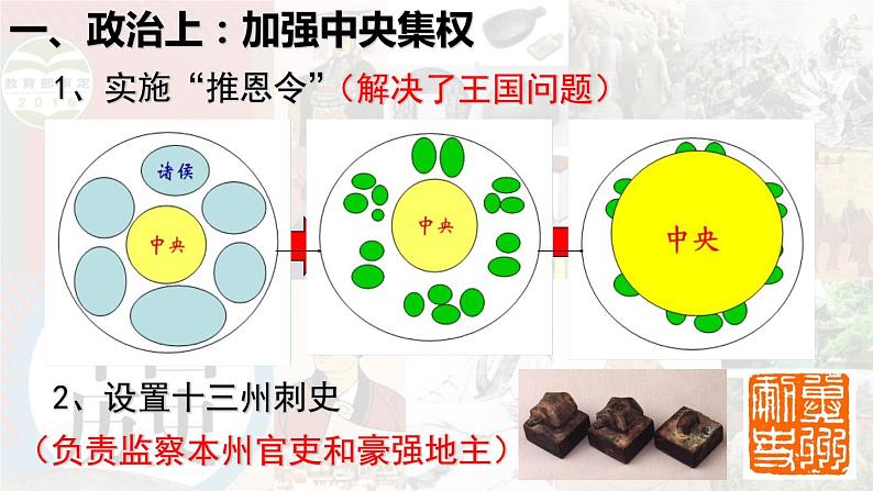 这是一份七年级上册第三单元 秦汉时期:统一多民族国家的建立和巩固第十二课 汉武帝巩固大一统王朝背景图ppt课件,共31页。PPT课件主要包含了雄才大略汉武帝,汉武帝,“推恩令”的实施,社会秩序混乱,1推恩令,内容结果,2刺史制度,盐铁专卖,秦“半两”,西汉“五铢钱”等内容,欢迎下载使用。