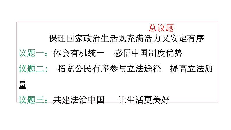 这是一份高中政治 (道德与法治)第一单元 中国共产党的领导第三课 坚持和加强党的全面领导坚持党的领导教学ppt课件,共30页。PPT课件主要包含了核心素养,总结提升,中国共产党提出建议,国务院拟定编制草案,其他国家机关贯彻执行,颁布实施,议学研讨,实现民主立法的途径等内容,欢迎下载使用。