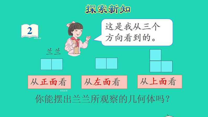 这是一份2020-2021学年1 观察物体(三)授课课件ppt,共14页。PPT课件主要包含了从正面看,从上面看,从左面看,然后从左边看,最后从上面看,你们有什么发现吗等内容,欢迎下载使用。